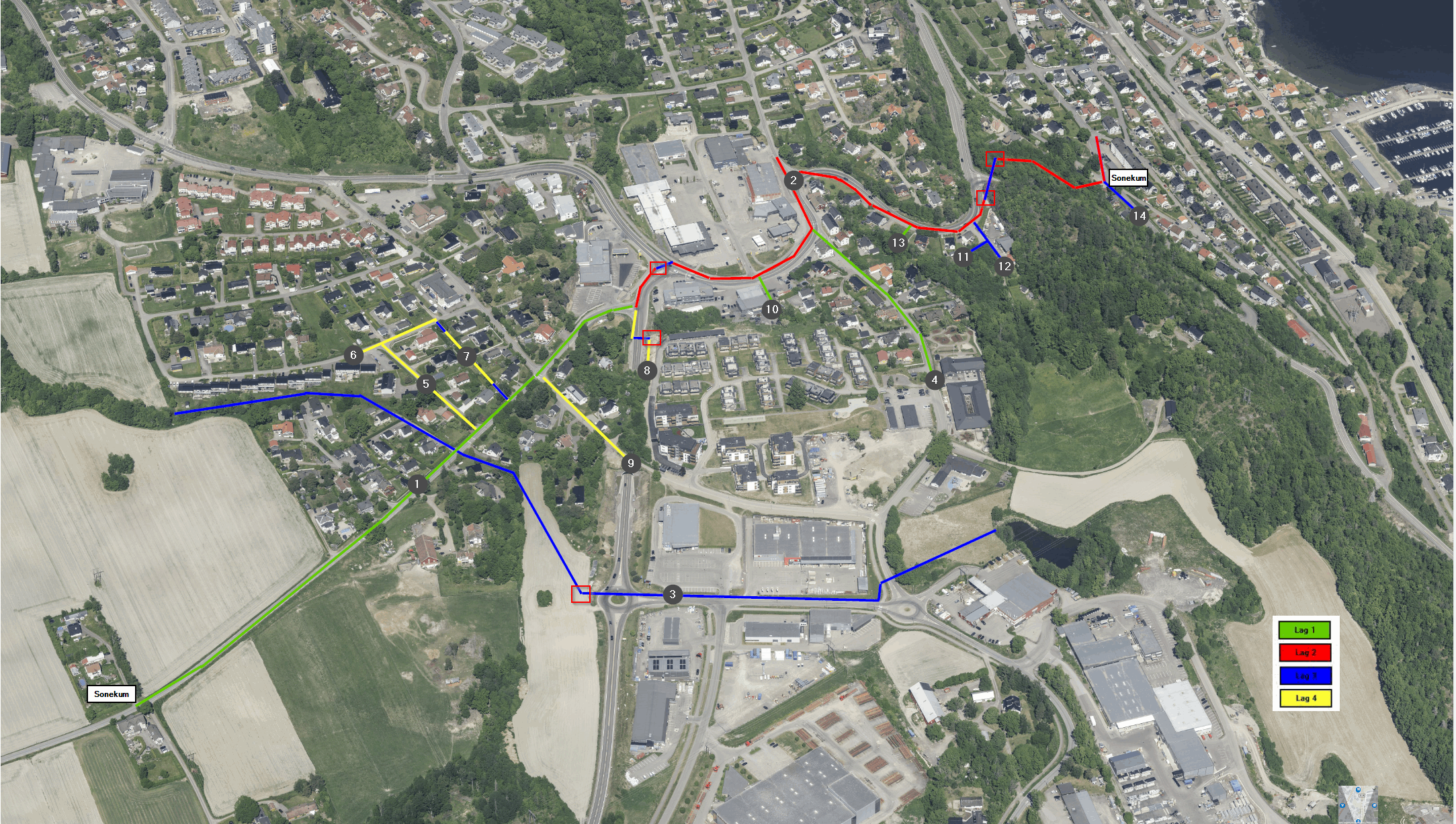 • Holtungveien: Traséen fortsetter her og avsluttes ved Holtungveien 29. Nye ledninger skal legges og eksisterende ledninger saneres i tilknytning til hovedtraséene.